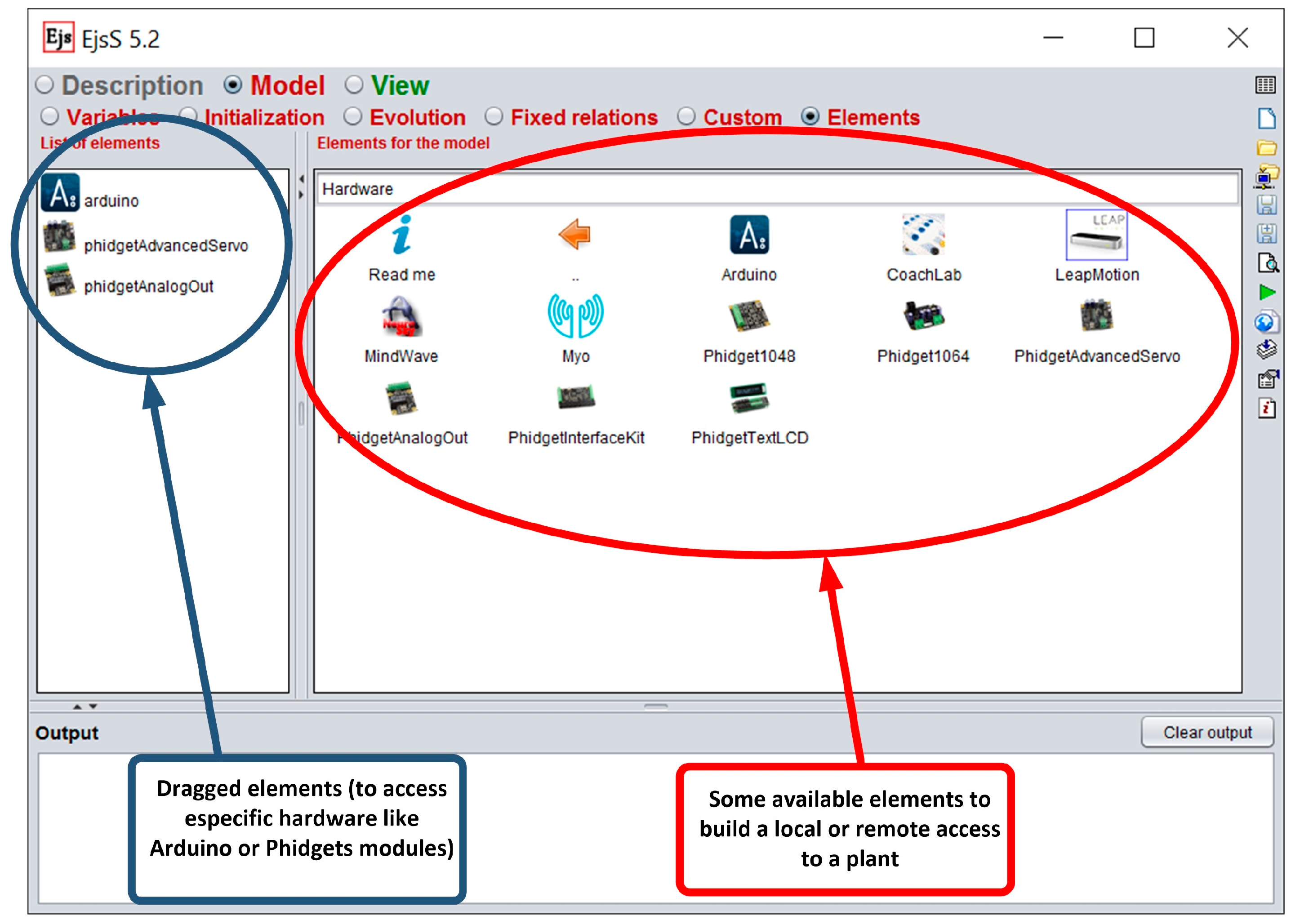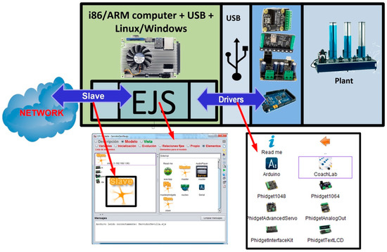 The i86 and ARM architectures allow the use of the Linux operating system and Java language. With the software elements designed and integrated in EJS, the user can access to the hardware devices with high-level functions. Thus, the connection to hardware devices from EJS is achieved by means of a software element for each device, represented by icons in EJS (see Figure 2). Therefore, the access to one device from EJS only consists of a drag and drop task and the configuration of the corresponding software element (port number, IP of the server, etc.).