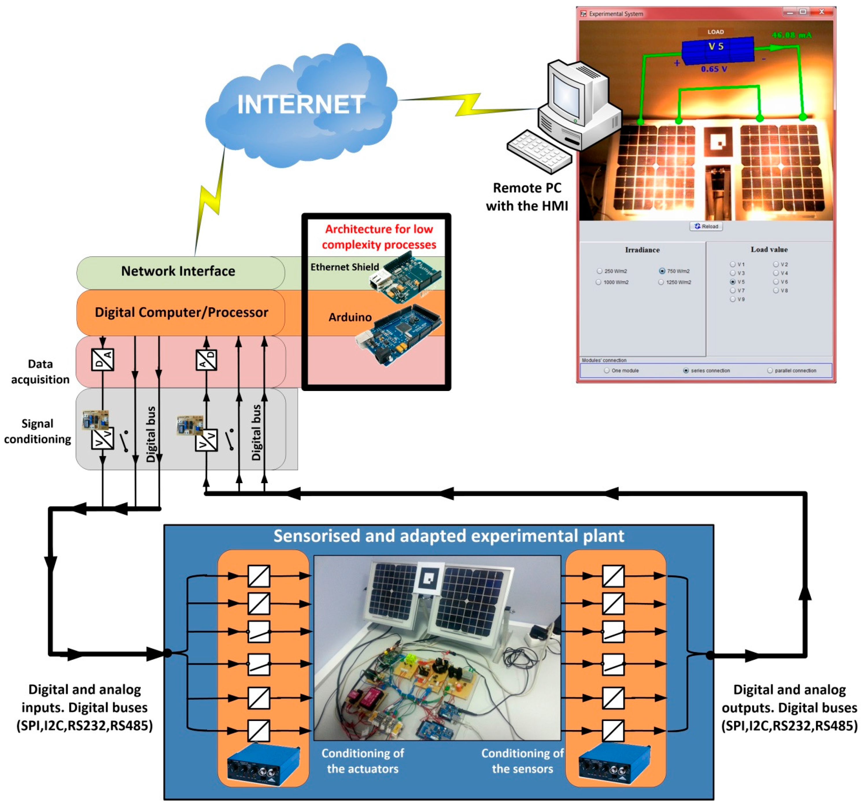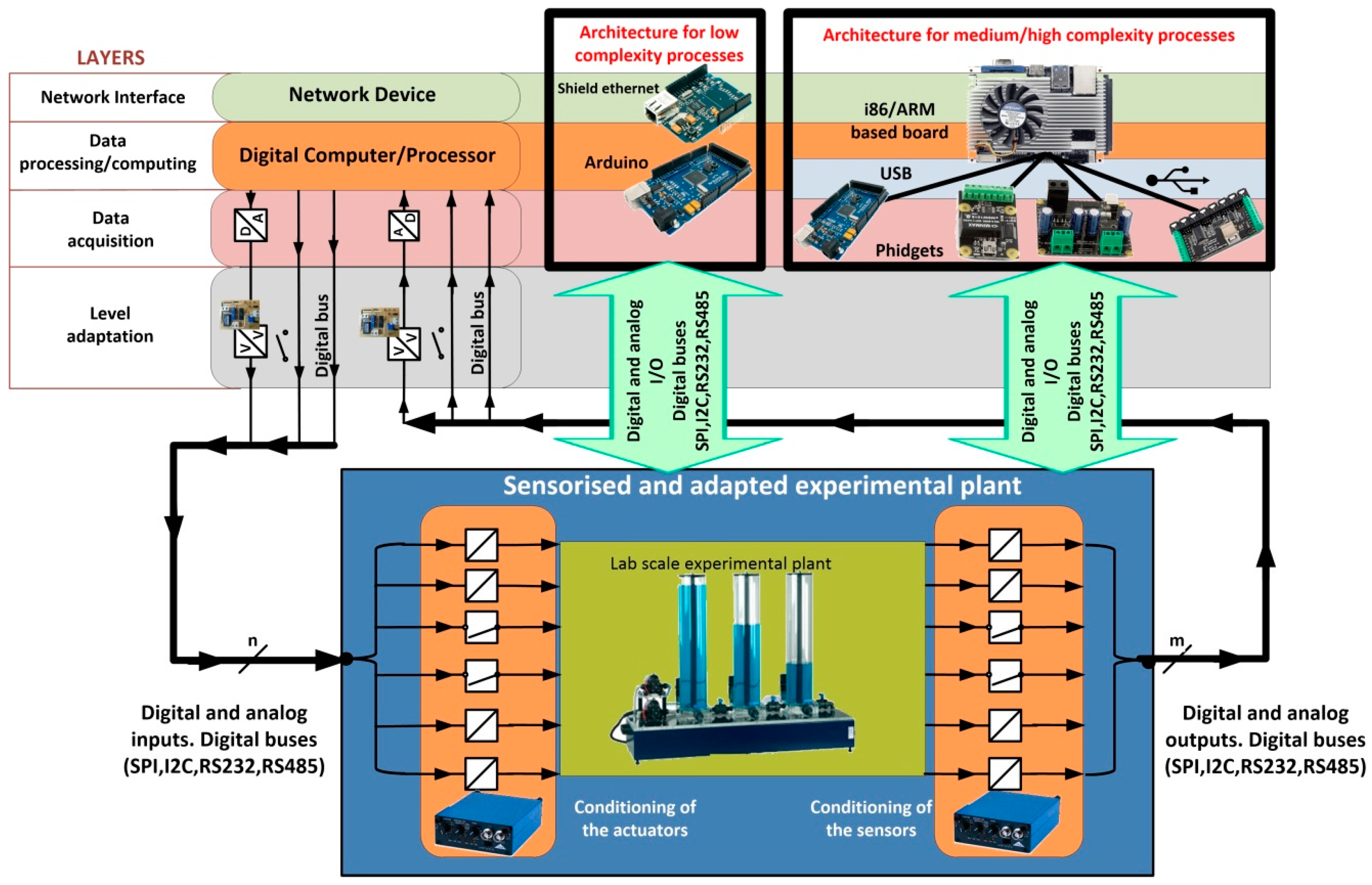 This layer carries out the voltage range adaptation between plant inputs/outputs and the data acquisition layer. Regarding digital signals, the logic levels of actuators and sensors could be different from those of the data acquisition layer. Therefore, the ranges must be adapted to appropriate levels (for example from 0/3.3 V to 0/5 V or vice versa). Bidirectional low cost devices are included to perform this adaptation. In the case of analog signals, their adaptation to the most commonly used digital levels in A/D devices (0/3.3 V or 0/5 V) is necessary.