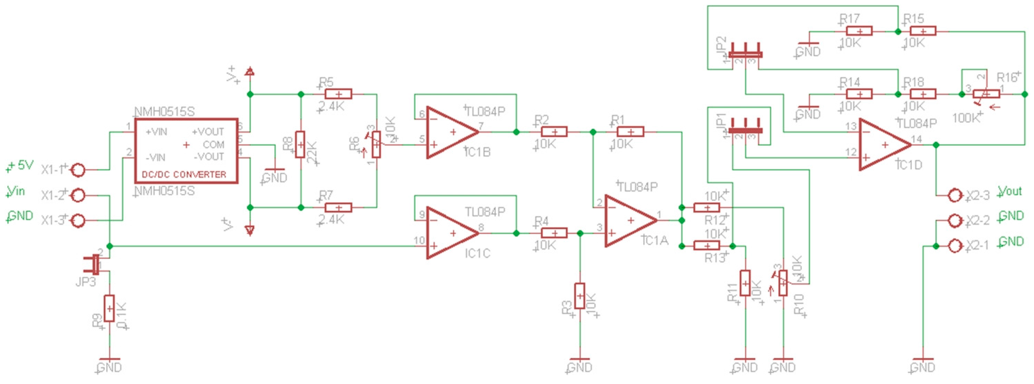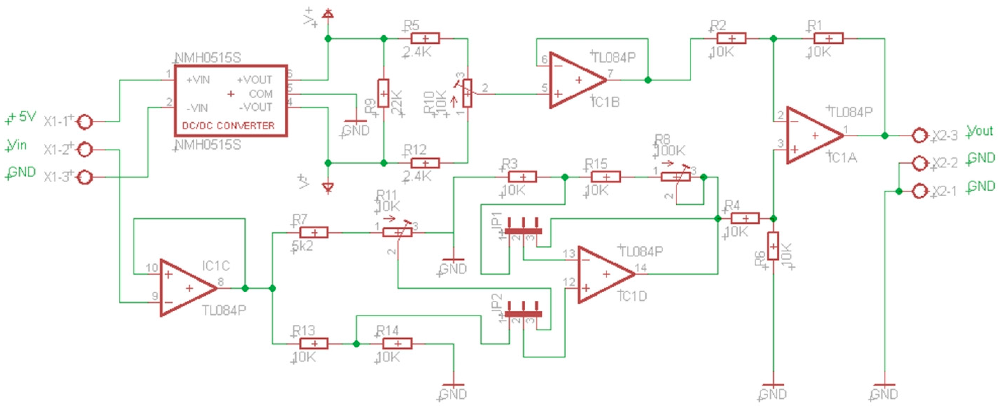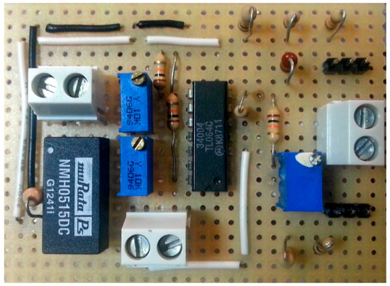 The layer of level adaptation should also map the output signals from the D/A converters located at the input of the plant. The actuators usually need voltages at the input of 0/10 V or −10/10 V. The output voltages from the D/A converters are usually 0/3.3 V or 0/5 V. To carry out this mapping, a circuit has been designed, Figure 5. This circuit includes, as the previous one, single voltage supply and independent setting (for negative values R10, and R11 or R8 for positive values, depending on the position of jumpers JP1 and JP2). Figure 6 shows a prototype of this circuit realized with a perfboard (DOT PCB).