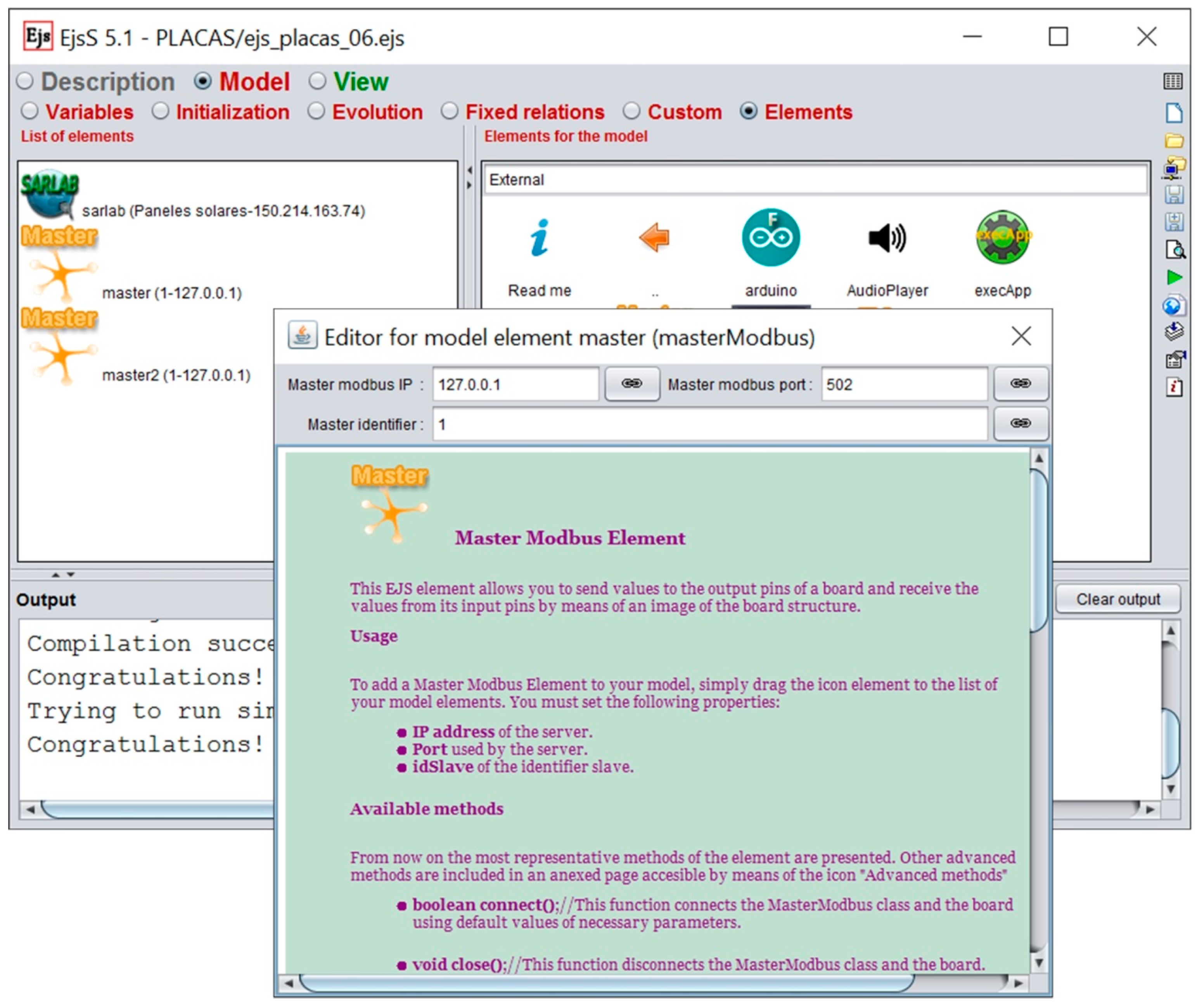The Modbus protocol keeps a data vector for each set of input-output pins of the data acquisition hardware. Each position inside each vector is constantly updated with the current value of the corresponding pin. Since Modbus is a master-slave protocol, the communications are initiated by the master, who is responsible for giving orders to the slaves. Slaves have only to fulfill orders received from masters. This approach requires placing the slaves on the plant side (see the lower left of Figure 7) and the master on the user interface side. Several elements have been developed in EJS to provide Modbus support both in the plant and in the remote user computer. Figure 8 shows the slave and master Modbus elements (in this case, two master Modbus elements has been added to the developed application, named master and master2). For example, to add a Master Modbus it is necessary set, in the configuration dialog box of the element, the following properties: