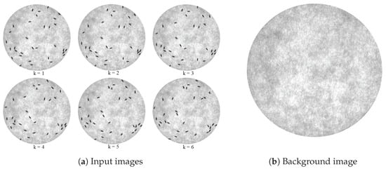 (a) Input images and (b) extracted background image. The input image contains six consecutive frames of a circular arena with 32 Drosophila as the black ovals inside. The background image was generated by using a number of frames from the same video file as the input images.