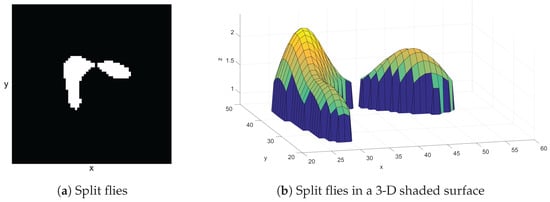 (a) Split flies in a 2-D scene and (b) in a 3-D shaded surface. The merging flies blob from Figure 4 was split by varying threshold values until the blob is split into an expected number of flies.