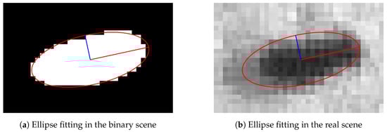 where a and b are major and minor axes, respectively. The orientation is represented by θ. Figure 6 shows an example of ellipse fitting to a blob (Figure 6a). Figure 6b shows the ellipse with the real scene. The major axis is represented by a red straight line while the minor axis is represented by a blue straight line.