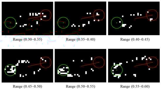 Figure 7 displays six filtered images with different threshold ranges. The image is the same as Figure 6. Two search points are created at the end of the major axis. The boundary of each search area is drawn as a red circle and a green circle. The higher the number of positive pixels that a search point found, the higher the probability of that point to contain wings. Thus, the heading direction is to the opposite direction. According to Figure 7, wings are located at the green circle and this implies that the true head of the fly is at the red circle.