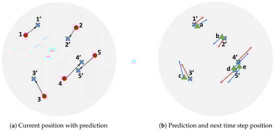 Figure 9 shows the overview of the tracking process. Suppose that the current frame is k (Figure 9a), trackers are labeled with number from 1 to 4 at each current position. All current positions are shown as red circles. The blue cross marks are predicted positions based on current positions and their velocities. For the next frame (Figure 9b), new positions are measured and shown as green triangles. The system then tries to pair each predicted position or blue cross mark to each measurement or green triangle by using the Hungarian assignment algorithm. There will be obvious pairs of , , and . These pairs match the state before prediction to the measurement as , , and . However, the remaining four points, , , d, and e, are quite problematic. If we continue without checking the heading direction, and will be the results from pairing. However, actually, the tracker number 4 should be paired with measurement d and the tracker number 5 should be paired with measurement e since the heading directions make more sense. To obtain proper pairing, the heading direction needs to be checked. For those that were rejected, we apply the closest neighbor between its state before prediction (red circle) and measurement (green triangle). In this way, the result will be and .