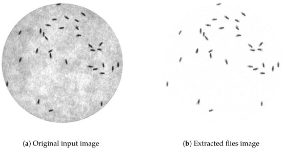 According to the input video, each fly appears as a dark object in the scene. The floor of the arena appears as a brighter object. Based on this statement, the proposed system detects flies using pixel intensity; a dark object will be detected as a fly. However, in some scenes, it is possible to have other objects, which are not the flies, appear in the scene, such as small tools, foods, etc. These objects appear in dark and will affect the detection process of the system. To get rid of those unwanted objects, background subtraction is performed. Figure 10 shows a grayscale input image and a scene after background subtraction. According to the figure, unwanted objects have been eliminated leaving only flies.