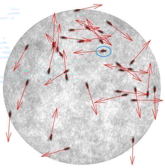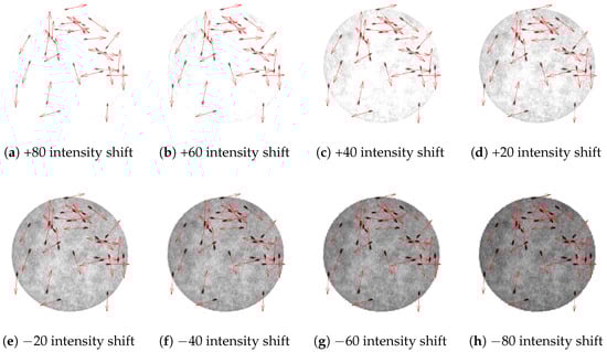 Figure 13 illustrates the result of the process of determining the heading direction of each fly from “Video_1”. Heading direction is shown as a red arrow for each fly. All the information such as position and heading direction, will be kept in each frame, waiting to be used in the tracking step. The system was also tested with various intensity shifting. Figure 14 shows the heading direction result of eight intensities of Figure 13. Having the 207 mean intensity value of Figure 13 as a reference, Figure 14a–d has a mean intensity shifted by , , , and , respectively. For a negative mean intensity shift, Figure 14e–h has a mean intensity shifted by , , , and , respectively.