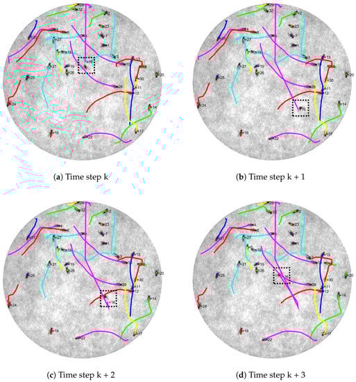 Figure 15 shows an example of tracking result. Each fly in the scene is labeled with a number corresponding to its tracker number. Let the current frame be frame t; the trajectory of the movement of each fly from frame to frame t is illustrated by a colored-line. According to the figure, all identities are assigned properly to all . In the case of a flying fly (fly number 16 that is enclosed by the black dotted rectangle), it can also be tracked by our system.