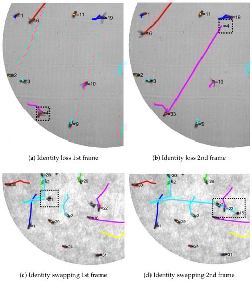 For Video_1 which is the main example in this part, the total number of frames is 1184 with 32 flies in a closed arena. The average velocity in each video is represented by . This average velocity shows how active the flies are in each video. The “Crossing” column from the table contains the number of crossing events that occurred in each video. The crossing event is an event in which two or more flies overlap, causing one detection. All errors were observed by the human eye for all frames. The swapping error was obtained from counting the number of identity swapping occurrences throughout all the frames. The number in the parentheses is the swapping error caused by the crossing event. Identity loss error is the cumulative number of losses of identity events. It counts when an identity leaves its current fly. The last column of the table represents the number of false positives (FP), the detection of non-fly objects and additional detection due to the error of blob splitting. For our tracking system, there are 10 flies swapping. There is no identity loss or FP throughout all the frames in Video_1 to Video_4. The identity loss in Video_5 occurred because of failure in the fly detection stage. It can be seen from Figure 16a that an additional detecting result was added to the fly number 4 and the identity number 4 was paired with another point in Figure 16b. This is a problem to our program since it uses a certain value of fly size to split a single blob of multiple flies. There will be no problem in a scene of multiple flies whose sizes are about the same, but it will introduce errors in a scene of flies varying in size.