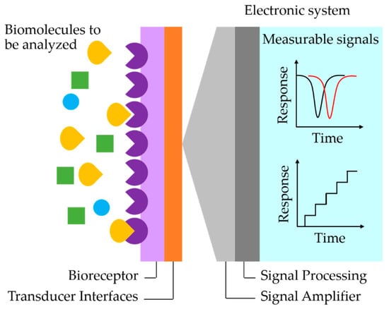 A biosensor is an analytical device which can detect a biomolecule-related element with an appropriate transducer to generate a measurable signal from the sample [,]. The biosensor system illustrated in Figure 1 shows a typical platform, consisting of a bioreceptor interfaced with a transducer. The bioreceptor has to be capable of recognizing the biomolecule element, for instance, enzymes, antibodies, DNA, RNA, and cells. In an incorporation, the biological signal that can be detected in various quantities by the receptor is transduced by physical, chemical, optical, thermal or electrochemical actions into observable information and analyzed quantitatively. The first generation of biosensor devices was introduced by Clark and Lyons [] to monitor chemical components in the blood of a surgical patient and to record quantitative biomolecule contents in blood. Since then, the applications of biosensors in the biomedical field and global healthcare have become indispensable for human life improvements in order to spatially analyze diseases through a patient [,,], to detect and to diagnose biomolecules [,,,,], to integrate with drug delivery [,,] and food safety []. In many efforts of the investigations, major requirements of biosensors are that the receptor has to not only be highly selective and specific to the biomolecular element, but also that the transducer needs to be ultrasensitive and with sufficient reproducibility for reliable real-time measurements. For more precision, the presence of chemical binding or biological specificity to an analyte in a labeled technique is used to ensure that only the labeled biological activities give a strong signal. However, this technique requires a labeling process in preparation and involves the fluorescent dyes, chemiluminescent molecules, photoluminescent nanoparticles and quantum dots [,,,,,,,,]. Alternatively, the label-free technique uses molecular, physical, mechanical, electrical, optical properties and charge interaction to monitor binding activities. The label-free methods can provide real-time tracking in biomolecular events and give more direct information about the target biomolecules without interference effects from the labeling procedure. Currently, label-free biosensors are essential for personalized genomics, cancer diagnostics, and drug development [,,] where the sensitivity is one of the key requirements that needs to be engineered for state-of-the-art biosensors [].