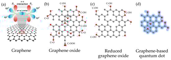 Structures of graphene-based materials show (a) the pristine graphene (pure-arranged carbon atoms) with sp2-hybridized carbon atoms, and the chemically modified graphene, including (b) graphene oxide (GO); (c) reduced graphene oxide (RGO) and (d) graphene quantum dot (GQD).