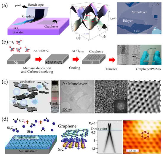 Several techniques of graphene synthesis: (a) graphene sheet is left on top of a silicon oxide wafer exfoliated by scotch-tape technique, its electronic band structure, and the real monolayer and bilayer graphene (Reprinted with permission from []); (b) Large scale process of graphene growth using (chemical vapor deposition) CVD and the transferred graphene to poly(methyl methacrylate) (PMMA) (reprinted with permission from []); (c) Liquid exfoliation of graphene showing crystalline honeycomb pattern on the exfoliated layer (reprinted with permission from []); and (d) epitaxial graphene growth on a silicon carbide (SiC) by sublimation of Si atoms and the structural characteristic of the monolayer graphene (reprinted with permission from []).