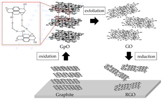 As a result of the oxidation of graphite there is an increase in the interlayer spacing. This means that the separation between graphene interlayers is expanded by the intercalation of oxidized contents or the polar liquids such as sodium hydroxide [] as seen in solid-state 13C-NMR []. The interlayer distance of 0.335 nm in pristine graphite increases to 0.562 nm after 1 h of oxidation and increases further to 0.737 nm after 24 h of oxidation. It is suggested that the carboxyl and alkyl groups are mostly at the edges of the GpO layers. By treatment via mechanical stirring or ultrasonication, the GpO can be exfoliated to GO easily with the same oxide contents. Moreover, the Hummers method can be improved by making a small modification []. The amount of potassium permanganate was doubled and the sodium nitrate was replaced by phosphoric acid in a proportion to sulfuric acid of (1:9). The improved method leads to a large amount of hydrophilic GpO being made compared to the original Hummers method. It highlights the fact that the oxidizing agents interact more with the basal planes of graphite. A high quality of GpO would promote the electrical conductivity after it was converted to graphene. Many findings make it possible to utilize GO and further composites [,].