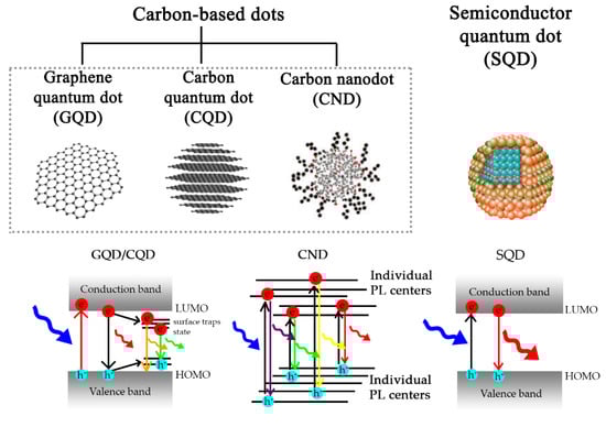 Schematic illustration and photoluminescent mechanism of carbon-based dots, including graphene quantum dot (GQD), carbon quantum dot (CQD), carbon nanodot (CND), compared to the quantum dots made of semiconductor (SQD).