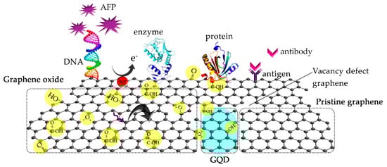 Previously, the structures and outstanding properties of graphene-based materials using different synthesis methods have been exploited in biosensing applications since graphene is a semi-metal with ultra-high charge mobility giving excellent electronic properties, having large surface area, being capable of being functionalized on its surface. There are many possible approaches to engineer the receptor for targeting biomolecules. In the biomedical field, pristine graphene is not only referred to as an oxide-free graphene presenting π-π stacking, non-covalent interactions and high electrostatic force, but it also offers an infinite surface at a molecular level. Therefore, graphene provides for a high possibility of active sites for charge-biomolecular interactions due to the large specific surface area leading to a sensing enhancement as well as supporting the desired functionalization to target biomolecules to improve the selectivity. Figure 6 illustrates the points of view of the possible interactions of the graphene-based material system. For example, the pure graphene area as shown in the figure can provide a charged area to absorb any charged molecules or metal ions as well as interactions at a vacancy defect. The functionalized graphene area is able to directly detect the biomolecules by its own oxide components due to the synthesis in which lots of epoxide, hydroxyl and carboxyl groups are formed on the edge and surface sites. In addition, the functionalized graphene allows binding of heteroatoms, nanoparticles (NPS), quantum dots (QDs), DNA, enzymes, proteins, antigens, antibodies, and other specific molecules [,,].