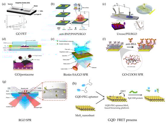 Biosensors based on the subtype of graphene materials or functionalized graphene GO, RGO, and GQD are widely used in medicine, biomedical, and bioimaging regimes. This is due to their extremely large surface area and ability to interact with various types of molecules. In addition, the outstanding properties of solubility, biocompatibility, and functionalization play an important role in sensing mechanisms. Currently, as shown in Figure 8, the GO-based FET has simply demonstrated glucose detection without an enzymatic glucose solution []. In this device, GO is used as the selective material to glucose while the sensitivity of the sensor is enhanced down to 1 μM by adding CuNPS and AgNPs. Interestingly, functionalized graphene oxide (GO) ink has been printed on a pentacene FET for detecting artificial DNA and circulating tumor cells []. Upon capturing the DNA by its phosphate group, the negative charge attracts holes at the grain-boundary of the pentacene layer and induces the collision or scattering in the region of the pentacene layer. Therefore, the mobility of the FET changes extremely achieving a high sensitivity of 0.1 pM and this could be improved for mass-scale production of printed biosensors. In a platform for ultra-sensitive urea detection, the RGO surface is decorated by the new construction of layer-by-layer assemblies of polyethylenimine (PEI) and urease []. The RGO FET of urea detection can be analyzed as the change of pH in liquid gate, by which shifting the Dirac point at the minimum voltage of <500 mV. The limit of urea detection is down to 1 μM with very fast response and good long-term stability. In addition, the introduction the Cu2+ improves the LOD down to 0.01 μM. In recent complex platforms, FET biosensors using RGO combined with PtNPS and anti-BNP have been explored as a brain natriuretic peptide (BNP) detector at the early stage level []. The BNP is a recognized biomarker and it is very important in heart failure diagnosis and prognosis. The RGO FET achieves the lowest of detection at 100 fM in a human whole blood sample.