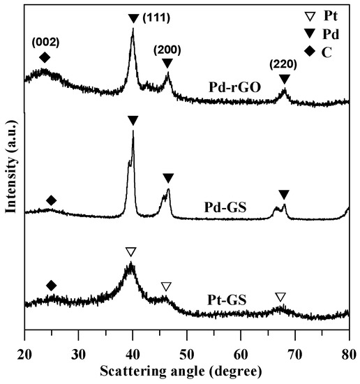 Figure 1 shows typical XRD patterns of as-grown Pd and commercial Pt catalysts, revealing the major diffractions of Pd (111) and Pt (111) crystal plane of face-centered cubic (fcc) crystals. As to the Pt-GS sample, the fcc Pt-lattice diffraction peaks appear at 39.5°, 45.9°, and 67.1° for (111), (200), and (220) planes, respectively [22,23]. The representative peaks at 39.8°, 46.2°, and 67.5° can be assigned to the (111), (200), and (220) planes, respectively, of the fcc Pd lattice onto both Pd-GS and Pd-rGO samples. The XRD patterns also shows weak diffraction peaks at ca. 2θ = 23.5–25.6°, resulting from the graphitic structure of GS and rGO sheets. Based on the Bragg’s equation, the carbon supports display different interlayer distances (d002), that is, Pt-GS (0.348 nm), Pd-GS (0.348 nm), and Pd-rGO (0.378 nm). This result demonstrates that the pulse microwave synthesis approach is capable of synthesizing highly-crystalline Pd lattices onto different carbon supports at low temperature within a short period.