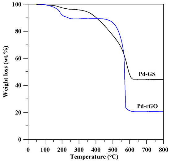 To further evaluate the thermal stability and the amount of Pd weight loading on carbon, thermal decomposition behaviors were investigated through the TGA analysis. The TGA curves, as shown in Figure 2, clearly depict a significant mass loss for both Pd catalysts, and the maximal weight loss takes place at ca. 540 °C (Pd-GS) and ca. 570 °C (Pd-rGO). The weight loss can be attributed to the decomposition of carbon content from the carbon support, thus producing CO2, CO, and H2O gases. It can be observed from the TGA curves that there are no obvious mass losses above 600 °C. Herein the residual weight can be used to evaluate the mass percentage of metallic Pd in the as-prepared catalysts. The mass percentages of Pd crystals are calculated to be 42.3 and 20.1 wt % for Pd-GS and Pd-rGO sample, respectively. The Pt loading in Pt-GS catalyst is very close to that in Pd-GS, approximately 42.5 wt %. The weight percentages for all catalysts also deliver crucial information for examining metallic surface loading: 0.47 mg·cm−2 (Pt-GS); 0.45 mg·cm−2 (Pd-GS), and; 0.23 mg·cm−2 (Pd-rGO).