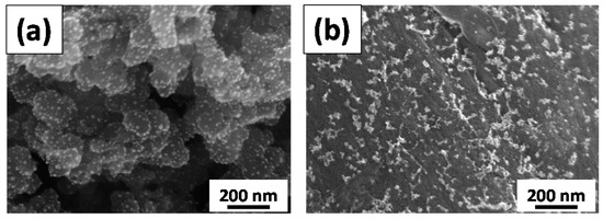 Field-emission scanning electron microscope (FE-SEM) images of different catalyst samples: (a) Pd-graphite sphere (GS) and (b) Pd-reduced graphene oxide (rGO).