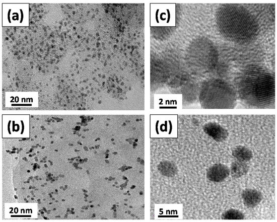 High-resolution transmission electron microscope (HR-TEM) micrographs of (a,c) Pd-GS and (b,d) Pd-rGO samples with low and high magnifications.