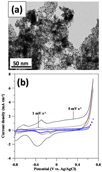 For comparison, the commercial Pt-GS catalyst was also employed for the evaluation of GOR activity. An HR-TEM photograph of Pt-GS catalyst is depicted in Figure 5a, confirming good dispersion of Pt nanoparticles onto carbon support. A large amount of Pt deposits are attached to the GS surface, and the average particle size of Pt is approximately in range from 3 to 5 nm. Due to its homogenous dispersion, there are almost no aggregations among the Pt particles. The GOR behavior on Pt-GS catalyst electrodes was investigated by using CV measurement in 0.1 M NaOH + 0.1 M glucose at 1 and 5 mV·s−1, as illustrated in Figure 5b. The topography of CV profiles indicates an electrochemical redox behavior in the potential range of −0.6–0 V vs. Ag/AgCl. The redox peak shows a shift to more positive potential at high scanning rate, revealing that the GOR process is controlled by the rate of heterogeneous electron transfer process. As for the GOR activity on Pd catalysts, the CV profiles of both Pd catalyst electrodes at different rates are shown in Figure 6.
