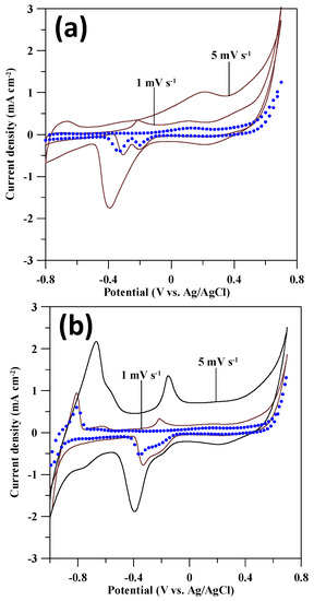CV profiles of (a) Pd-GS and (b) Pd-rGO catalyst electrodes in 0.1 M NaOH + 0.1 M glucose. The symbols represent the CV profiles measured at 1 mV·s−1 in 0.1 M NaOH without glucose.