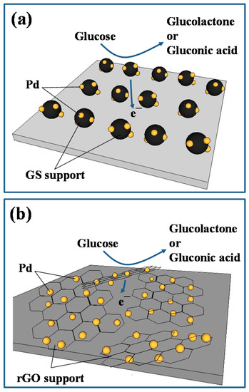 As described by the multiple reaction steps (i.e., R1–R4), the non-enzymatic detection of glucose is strongly depended on the design of Pd catalyst electrodes. As observed from the CV profiles, the oxidation peak current is considered as an index in evaluating the specific activity of GOR on the Pd catalysts. Based on the units of metal weight, the specific current at 5 mV·s−1 on Pd-rGO catalyst can reach as high as 6.09 Ag−1, approximately three times higher than that of Pd-GS catalyst. This improved catalytic activity is attributed to the fact that the Pd-rGO catalyst electrode possesses a conductive two-dimensional network, composed of homogeneously dispersed Pd nanocatalysts. The schematic diagram for describing the GOR on both Pd-GS and Pd-rGO catalysts is briefly described in Figure 7.