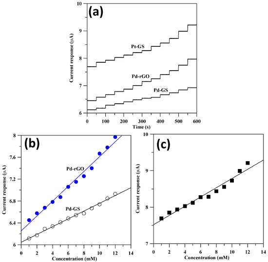 The calibration curves of the amount of injected glucose and current response could be correlated and collected in Figure 8b,c. The linear plots show good correlation with the experimental data for all catalyst electrodes toward the glucose detection with the entire concentration range. The calibration curves display good linear fits within the concentration range of 1–12 mM with correlation coefficients Pt-GS (0.965), Pd-GS (0.993), and Pd-rGO (0.988). It is well known that diabetes mellitus is diagnosed by detecting a blood glucose concentration higher than normal range of 4.4–6.6 mM [9]. Thus, the glucose sensor developed by our group can be applied to determine the level of blood glucose without any further dilution treatment. The as-prepared Pd-rGO sensor presents a wider linear range as compared to other single noble metal catalyst electrodes. A comparison of non-enzymatic sensors with enzymatic glucose sensors was based on noble metal nanoparticles supported on various carbon supports, including Nafion/glucose oxidase/Pd/carbon nanofibers: 0.06–6 mM [2], glucose oxidase/Pd/chitosan/graphene: 0.001–1 mM [25], glucose oxidase/Pd@Pt nanocubes: 1–6 mM [26], Au/graphene oxide/carbon sheet: 0.05–4.9 mM [27], and Nafion/Au/Ni-Al layered double hydroxide/carbon nanotubes/graphene: 0.01–6.1 mM [28]. It can be concluded that the design of noble metal-coated catalyst electrodes achieve high sensitivity but narrow detection range. Moreover, the microwave-assisted synthesis method takes advantages involving facile preparation procedure, time saving, and without costly glucose oxidase. The sensitivity of the catalyst electrodes was analyzed by plotting the current response over the analyte concentration. The sensitivity for all catalysts is ordered as Pd-rGO (1.18 mA g−1·mM−1) > Pt-GS (0.54 mA g−1·mM−1) > Pd-GS (0.32 mA g−1·mM−1) according to the linear plots. The sensitivity was obtained based on the units of metal weight. This result reveals that the sensitivity of Pd-rGO catalyst electrode can be significantly enhanced by 3.7 times, as compared to Pd-GS catalyst. Accordingly, the Pd-rGO catalyst offers high sensitivity and superior electrocatalytic activity, mainly contributed by the synergetic effect that combines small crystalline size and two-dimensional conductive support, thereby leading to high accessibility to non-enzymatic catalysis of glucose.