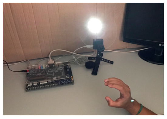 The system presented in this paper is fully implemented in a FPGA. It classifies 24 of the ASL alphabet signs using the external contour of the hand in images received from a neuromorphic sensor. It consists of three main sub-systems, the first dedicated to communicating with the camera sensor and receiving the events, the second is the image processing algorithms, including noise filtering and edge sorting, and the last step is the classification using a system composed of a dynamic neurons, static ANN, data adjusting algorithms, and a comparator. As can be seen in Figure 1, the experiments have been performed in a controlled environment, with the sensor placed at approximately 30 cm from the hand user. Since the neuromorphic camera detects changes in the scene luminosity, a white light lamp synchronized with the system focused on the user hand has an on–off controller to ensure the light changes in the hand. This guarantees that all of the pixels of the hand will exceed their internal threshold sending the event.