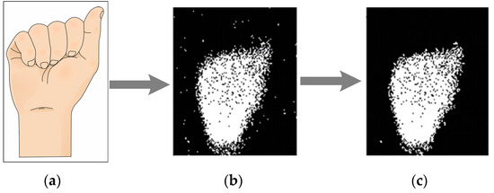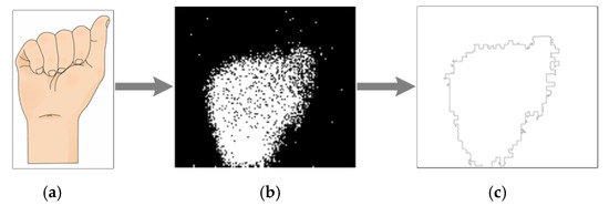 Image to event transition and events filtering of “A” sign, (a) ASL alphabet sign; (b) raw data sent by the neuromorphic sensor; (c) image after filtering.