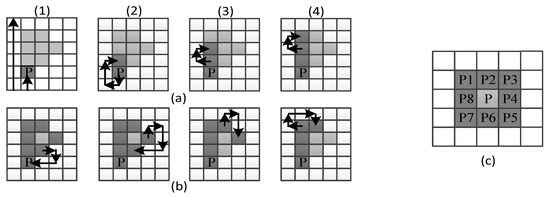 Moore–Neighbor (MN) algorithm demonstration, (a) starting steps for MN algorithm; (b) last steps for MN algorithm including stopping criterion; (c) Moore neighborhood of a pixel P.