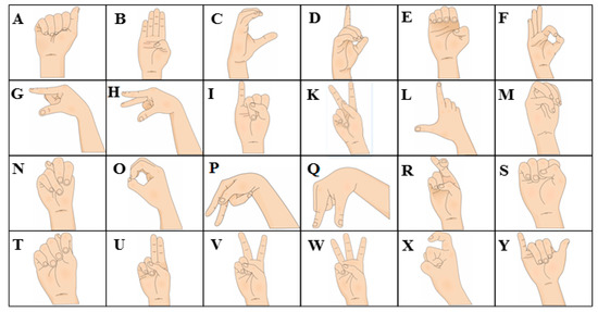Figure 22 shows graphics with the signatures obtained in the image processing stage for the ASL alphabet signs, whose vectors are the input for the classification system. As shown in Figure 22, the letters “Q” and “L” have few similarities with other ASL sign arrays.