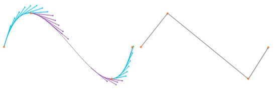 In Figure 8, where violet and blue arrows represent negative and positive slopes, respectively, the main vertices are characterized for being found in vertical slope sign changes; thus, by storing these points, the quantity of characteristic pixels is reduced without losing the main shape of the line. With this elimination criterion, the quantity of characteristic pixels is reduced to approximately 15. Using this compact characteristic array of pixels, it is feasible to classify the ASL signs.