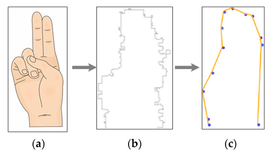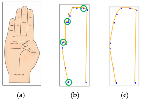 Size selection: (a) “B” ASL alphabet sign; (b) image processing result with 20 characteristic pixels; (c) image processing result with 10 characteristic pixels.