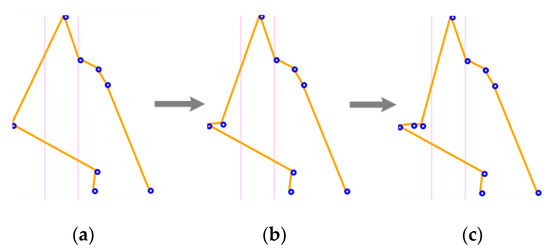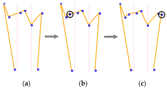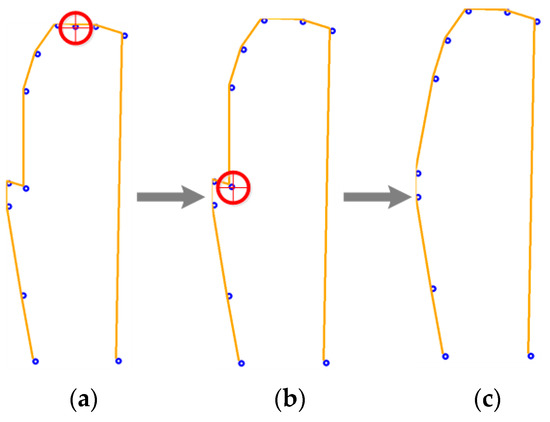 Figure 11 graphically represents the resulting array in each cycle of the previously mentioned reducing algorithm. The eliminated points are surrounded by red, the shape on the left represents the result of the vertical slope algorithm with 12 characteristics pixels, and the shape on the right Figure 11c represents the input for the ANN.