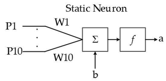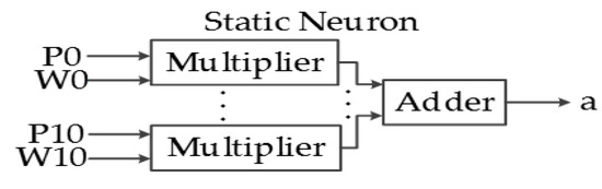 The main purpose of this system is to classify the ASL alphabet based on the characteristic array of the image; thus, a pattern recognition network is designed in hardware and implemented in a FPGA. ANNs consist of a finite number of basic artificial neurons that exchange data. The static neuron is the most basic block of the ANN implemented in this system, and its structure is presented in Figure 14. The output function f depends primarily on the application of the ANN and the connections of the neuron.