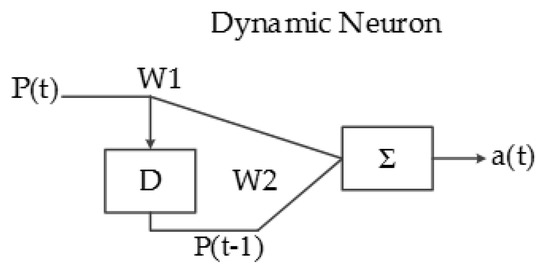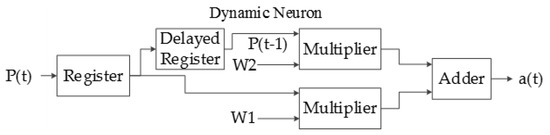Another type of artificial neuron implemented in this system is called the dynamic neuron (DN), which has a delayed behavior and the capacity of storing information; the input of the DN is sequential, as can be seen in Figure 15.
