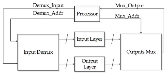 The processor used to communicate with the DVS is also used to control the ANN implemented in hardware. This represents a reduction in the complexity for the network usage, which also increases the performance of the whole system. The connection between the ANN and the processor is achieved using only four digital buses, two address buses and two data buses. The inputs and the outputs of the ANN are redirected using a demultiplexer and a multiplexer, respectively, as shown in Figure 20.