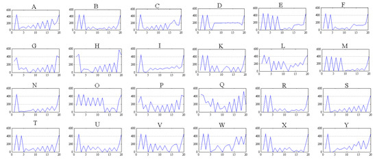 ASL alphabet signs signature used including letters from A to Y excluding letter J, where the X-axis represents the 20 X–Y coordinates of the 10 characteristic pixels in the format (X1, Y1, X2, Y2, …, X10, Y10) and the Y-axis represent the value of the coordinates.
