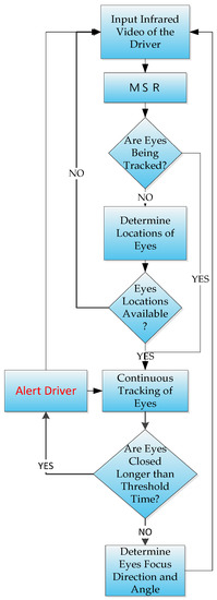 15] is used to track the eyes continuously. The areas in the images containing the eyes are used to determine whether the pupils are present. If the pupils cannot be located in either eye then it is assumed that the driver is either looking downward or has his/her eyes closed due to drowsiness. If the pupils cannot be detected for longer than a preset threshold, then a warning would be issued. The flowchart for this component is shown in