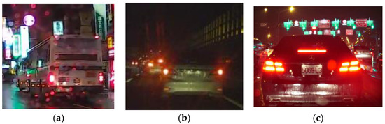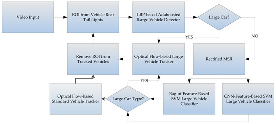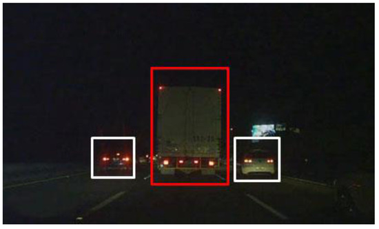 14], which differs from the purpose and method of our study. Our study uses the video driving recorder onboard the vehicle itself to identify the presence of vehicles ahead, and to differentiate large vehicles from other vehicles. Our study seeks to determine the existence of situations at night when the driver should be alerted in real-time. These situations include the driver’s lowering of attention or drowsiness; i.e., not in a sufficiently wakeful state to process warnings, and when the driver’s vehicle is in the vicinity of large moving vehicles. These situations are determined using two different components. The driver’s attention-level detector component uses the images from a driver-facing infrared camera as input, then a version of the MSR function is applies to improve its contrast before processing. A trained LBP-based Adaboost classifier to determine the initial locations of the eyes, then a tracking algorithm [