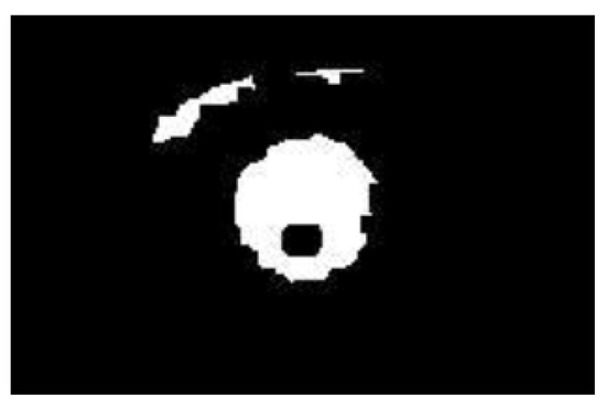 The regions containing the eyes are then passed to a pupil detection algorithm, which seeks to determine whether the driver’s eyes are open. This is done by using a heuristic of first inverting the video within these regions then thresholded so that reflection of the infrared lights reflected by the pupils would appear as black surrounded by white pixels, as shown in