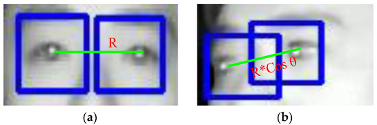 R represent the distance between the eyes when facing front, and θ approximates the angle the head rotation. The rotation angle θ, is approximated by the following equation: