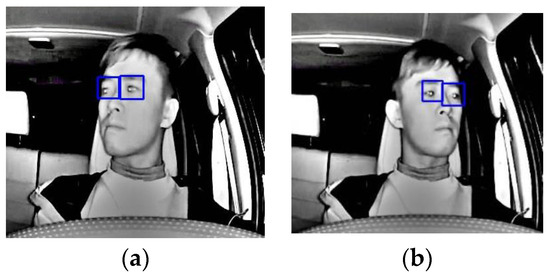 Figure 7, the tracking of driver’s eyes when the driver’s head is rotated are shown. In order to test the detection accuracy, a total of five infrared video sequences of four different drivers were used to test our heuristic, and an average accuracy of 94.26% was achieved. That is, 94.26% of the times the instances where the driver’s eyes are closed or when the eyes are opened, are correctly identified. The individual results will be shown in the experimental results section. This value is comparable to the average of around 92% (without validating the eyes during tracking) obtained by [