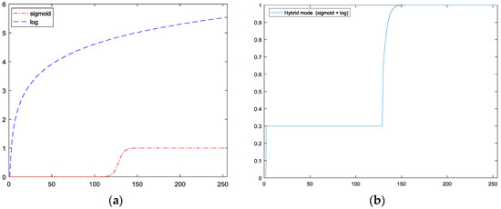 Figure 9a, for night scenes processed using the Log-based MSR can be over-exposed, resulting in significant loss of data. By contrast, a Sigmoid-based MSR, because its upper cut-off is at 1, so it is considered to be a rectifier, which could minimize the loss of data. However, the standard Sigmoid function quickly reaches the lower cut-off at 0, has the effect of losing critical information, when ratio in the region is low, so we choose to suppress this effect by modifying the MSR by replacing its values of Sigmoid function with the values of Log function values when the ratio falls below 0.3, as shown in