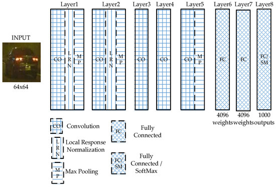 26] architecture in classifying images of night-time vehicle images. We used a total of 23,066 images of large and small vehicles started at 90% for training (10% for test), and slowly decreased the ratio of training data until the features from one of the structure gave us an error in classification. Using this process, we finally chose AlexNet. Another reason for selecting AlexNet was results of [