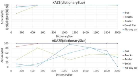 Figure 11 shows that the dictionary size has relatively little effect on the KAZE features from 500 onward, while it greatly impacts the performance of the AKAZE features, so a single value for dictionary size that would work for the AKAZE BoF classifier could not be easily found; we finally settled on 1500 as default. Also, in another experiment in classifying night-time vehicle images, we found that the performance of the AKAZE features could not match those of KAZE, due to the fact that the AKAZE feature point detector detects far fewer key points than those of the KAZE detector. This will be discussed in the experimental results section. So from the result of these experiments, it appears that the KAZE-based BoF classifier would be a better choice than the AKAZE-based BoF classifier.