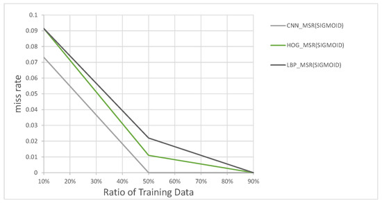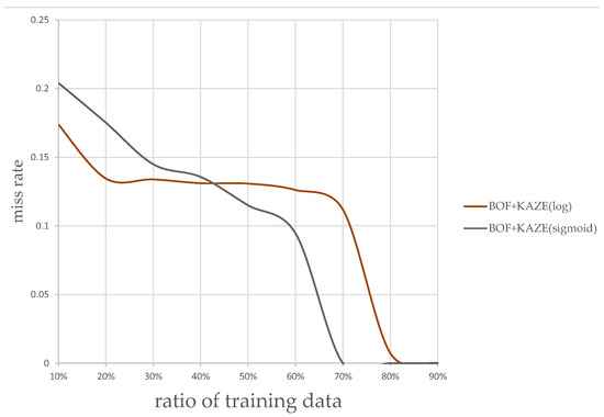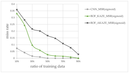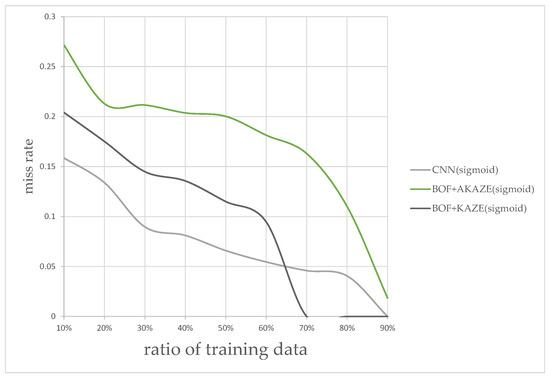 Figure 20 shows the miss rate vs. ratio of training data for this type of images only, at different training ratios. It is clear that the CNN-features-based classifier performed better for the ratios between 10% and 60%, but then the KAZE-based classifier shows better performance for the ratios after 65%. The result of this experiment shows that it would be wise to keep the KAZE-based classifier in our flowchart as a backup to catch the false-negatives.