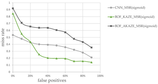 Figure 17, are used to classify and generate the plots of miss rate vs. false positives (i.e., misidentified as large vehicles) for the CNN, KAZE and AKAZE classifiers. They are preprocessed using our Sigmoid-based MSR before classification training and testing. The results are shown in