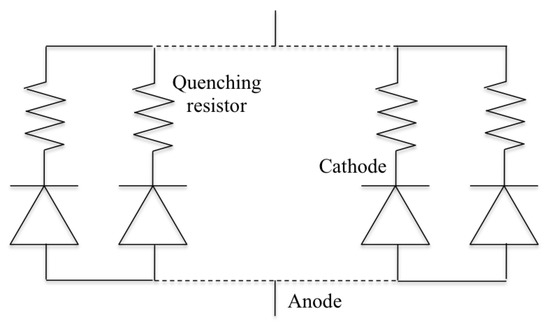 The application of silicon technology to the development of low photon flux sensors—later known as silicon photomultipliers (SiPMs)—can be traced back to the late 1970s [1], when a space-distributed fine array of metal resistor semiconductor (MRS) micro-sensors was conceived with individual quenching and common output. Since then, the SiPM R&D is dominating the panorama of modern research in the field of low photon flux detectors, with the synergy and unique contribution of a large number of groups during the last 30 years [2,3,4,5,6,7,8,9,10]. Modern SiPMs are composed of an array of p/n-junctions (microcells) operated in Geiger mode, with individual passive quenching resistors, as reported in Figure 1. SiPM exhibits a clear response to single photons and an impressive photon number resolution at room temperature. In parallel, single photon avalanche diodes (SPADs) emerged in the area of single photon sensors [11]. The SPAD is a single photon detector operated in Geiger mode. Its optical sensing part is equivalent to a SiPM microcell. The layout of a SPAD differs from the one of a SiPM, as it also includes integrated active quenching electronic components [12]. In other words, the SiPM is equivalent to an array of SPAD-like microcells with passive quenching.